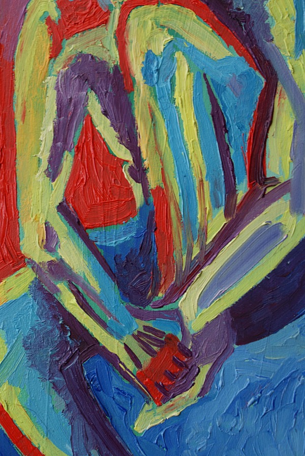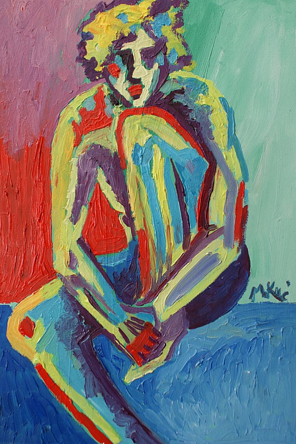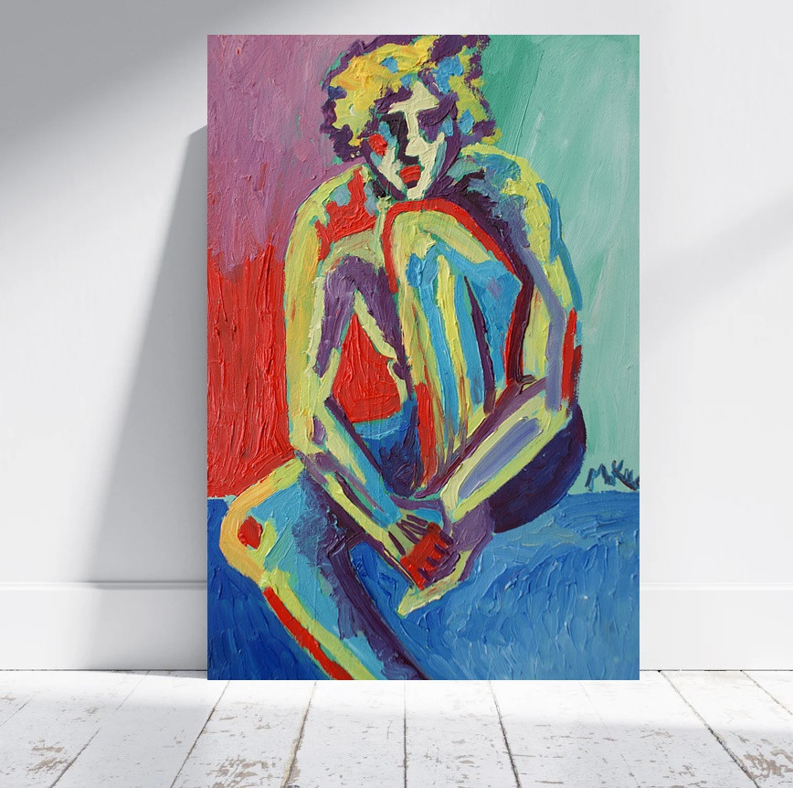 Ten obraz to prawdziwy color explosion! Dominują na nim intensywne barwy, takie jak czerwony, niebieski i zielony, które tworzą dynamiczną i pełną energii kompozycję. Postać na obrazie wydaje się zamyślona, a jej abstrakcyjne kształty nadają całości wyjątkowego charakteru. Nieco chropowata faktura uzyskana dzięki grubej warstwie farby olejnej dodaje dziełu fizycznej głębi. Atmosfera jest pełna napięcia, jakbyśmy byli świadkami momentu głębokiej refleksji czy emocjonalnego zmęczenia.