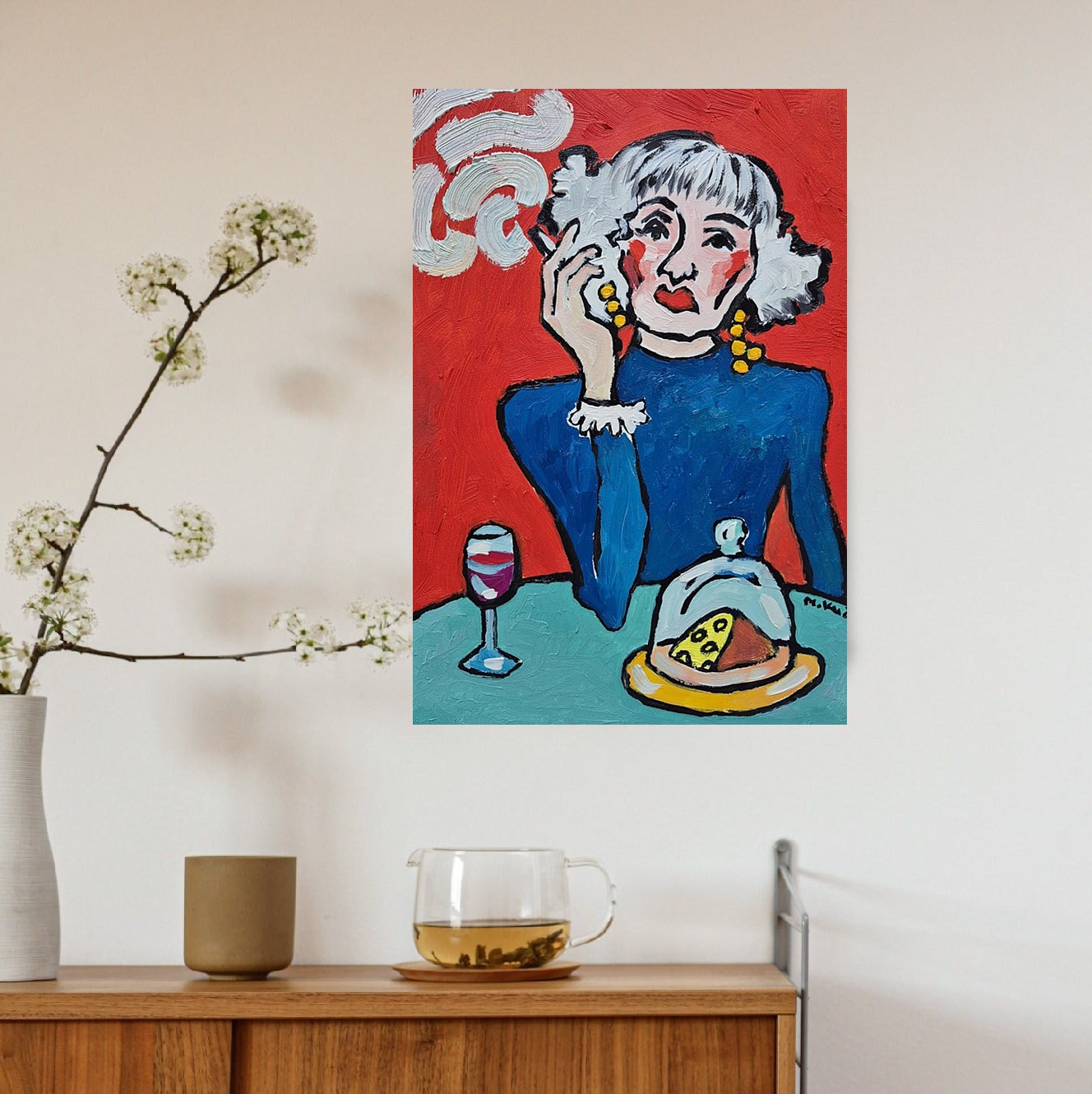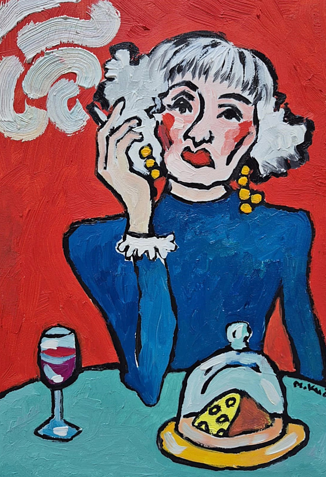 Granatowa sukienka chłodzi kompozycję, wprowadza spokój w ten emocjonalny żar tła. Żółte kolczyki migoczą jak drobne znaki radości albo ironii. Przed nią stół: kieliszek wina, jeszcze nie do końca opróżniony, i ser przykryty kloszem — codzienny rytuał, mała celebracja samotności lub ciszy.
