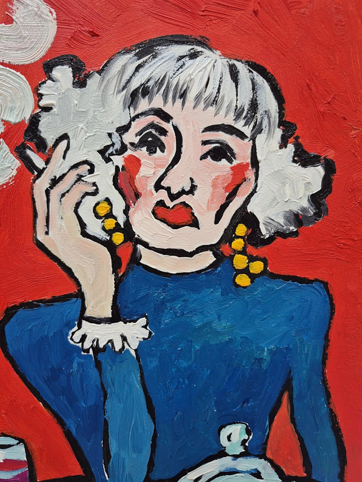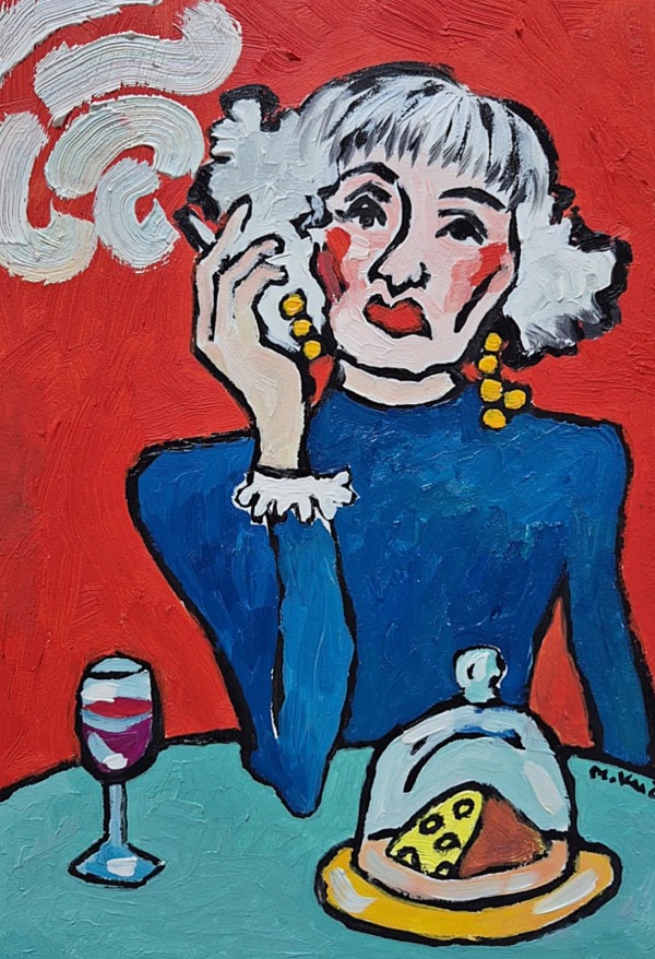 Na tle intensywnej, niemal krzyczącej czerwieni siedzi kobieta jak wycięta z własnych myśli. Ma twarz zbudowaną z grubych, zdecydowanych pociągnięć pędzla — trochę surową, trochę czułą. Jej spojrzenie nie szuka kontaktu z widzem jest gdzieś obok, może w przeszłości, może w planach na później. Białe włosy układają się jak chmury, a dym, który unosi się z papierosa, zdaje się być ich przedłużeniem — myślą, która nie chce zostać wypowiedziana.