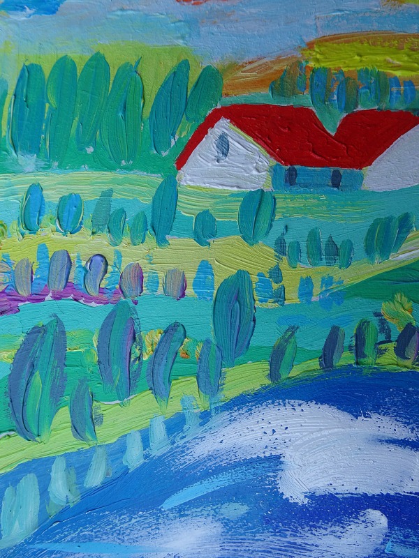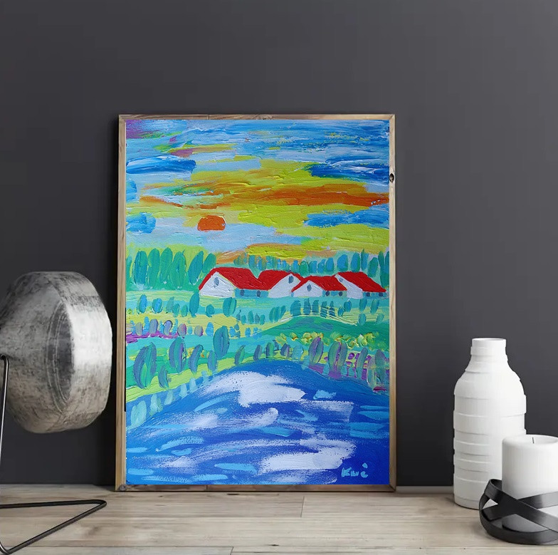 Obraz namalowany olejami na płycie o wymiarach: a4, 21/29,7 cm, sygnowany z przodu. Jest to moja autorska kompozycja. Świetnie może być eksponowany w nowoczesnych wnętrzach o stonowanej kolorystyce. Swoimi barwami może rozjaśnić takie wnętrza, w oświetleniu dziennym, jak i sztucznym.
