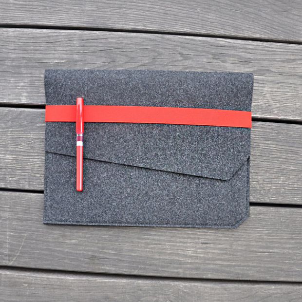 Nasz praktyczny organizer do torebki to stylowa alternatywa dla tekturowych teczek na dokumenty. Do jego wykonania użyliśmy wysokiej jakości filcu poliestrowego, który dodatkowo powleczony został z zewnątrz impregnatem, co zapobiegać ma mechaceniu się. W środku bez problemu zmieścimy nawet pokaźny plik kartek formatu A4. Klapa jest zabezpieczona czerwoną taśmą z gumy. Pod klapą znajduje się też uchwyt na długopis. Na indywidualne życzenie można zamówić organizer do torebki o innych wymiarach.