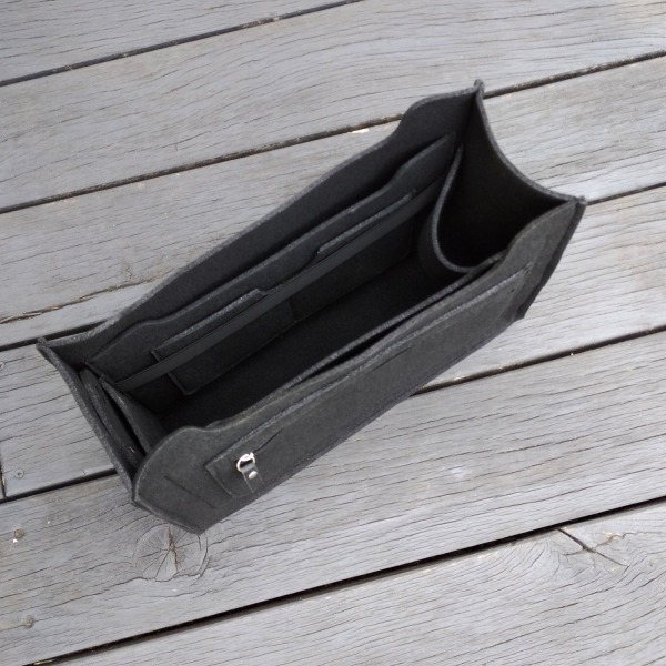 Wyprofilowany, filcowy organizer do torebki to znakomite rozwiązanie na uporządkowanie wszystkiego co nosimy w luźnej torebce. Uszyliśmy go z wysokiej jakości filcu w 100% poliestrowego, specjalnie zabezpieczonego przed mechaceniem się. Usztywni wnętrze i spód torebki. W środku znajdziemy 4 wygodne i praktyczne kieszonki. Na jednej z nich zamontowana szeroka czarna guma. Jeden uchwyt na wodę. Po drugiej stronie filcowego organizera znajdziemy odczepiane etui na długopisy. Na zewnątrz kieszeń na zamek. Suwak ozdobiony czarną skórą naturalną. Istnieje oczywiście możliwość zamówienia organizera do torebki o innych wymiarach.