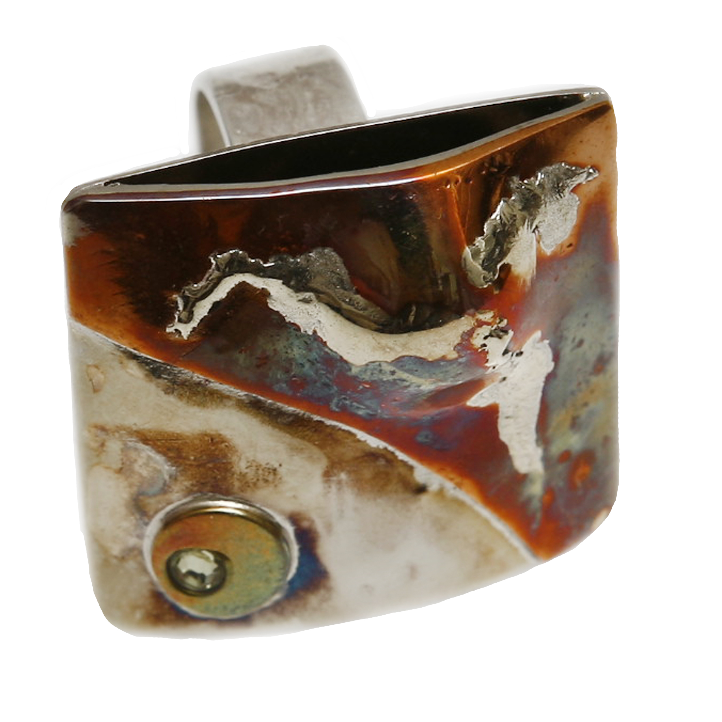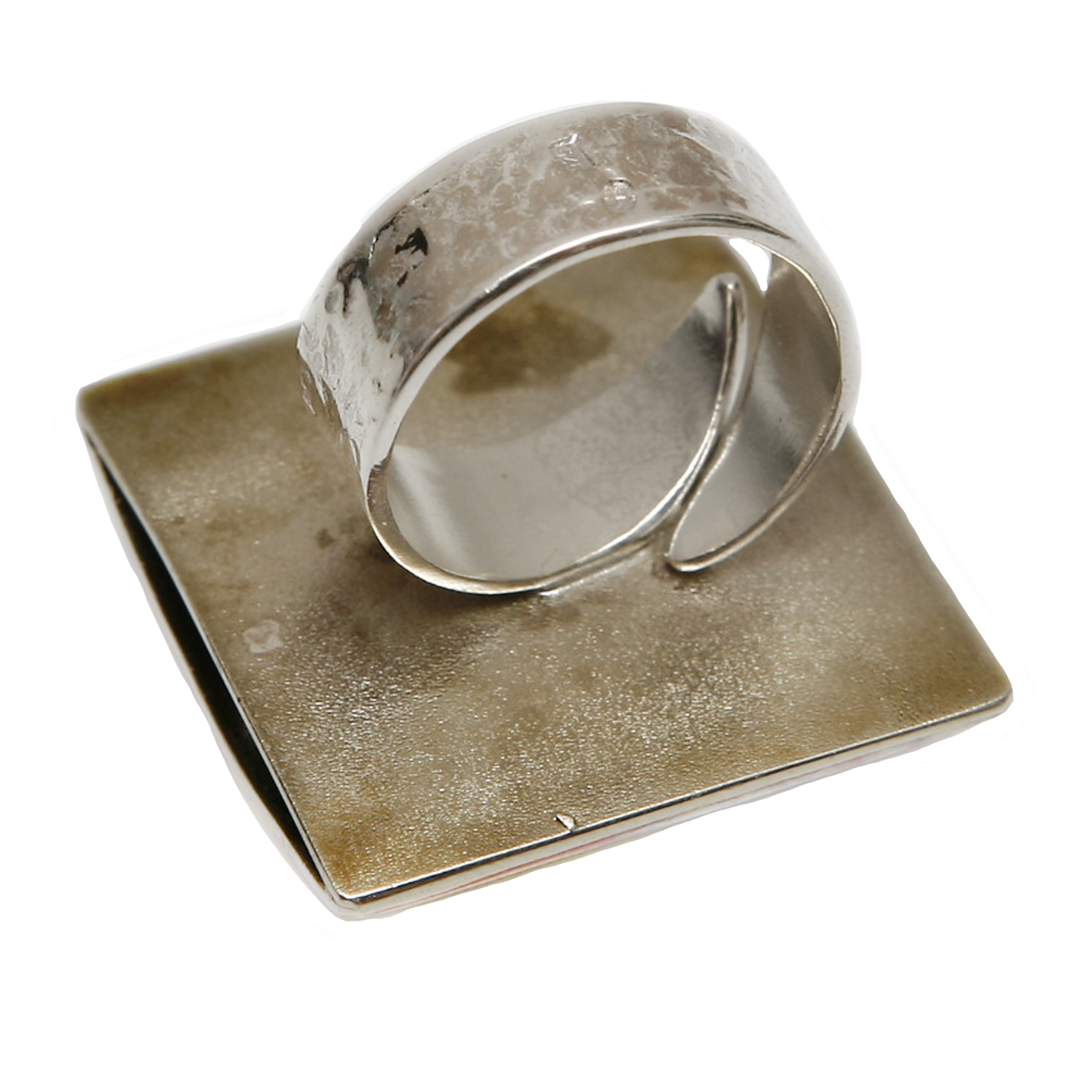 Pierścionek „OKO PUSTYNI” o wymiarach 28/28 mm, wysokość wypukłości 6 mm – regulowana srebrna obrączka o średnicy 17 mm, szerokość obrączki 8 mm z najnowszej kolekcji „Fantazje kolorowych metali” to mieszanka miedzi, mosiądzu, alpaki i srebra, oczko białe – kryształek Swarovskiego, pierścionek lekko wypukły - przestrzenny, waga 12 g.