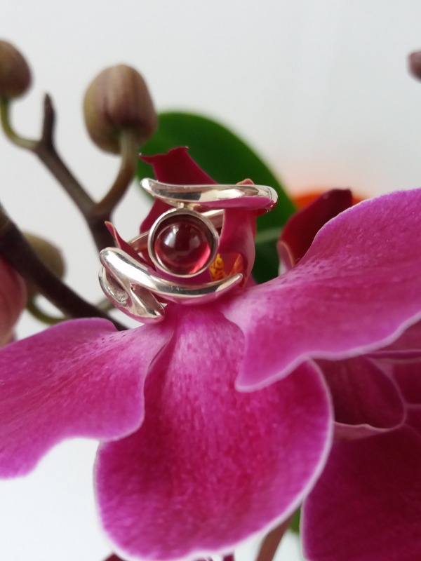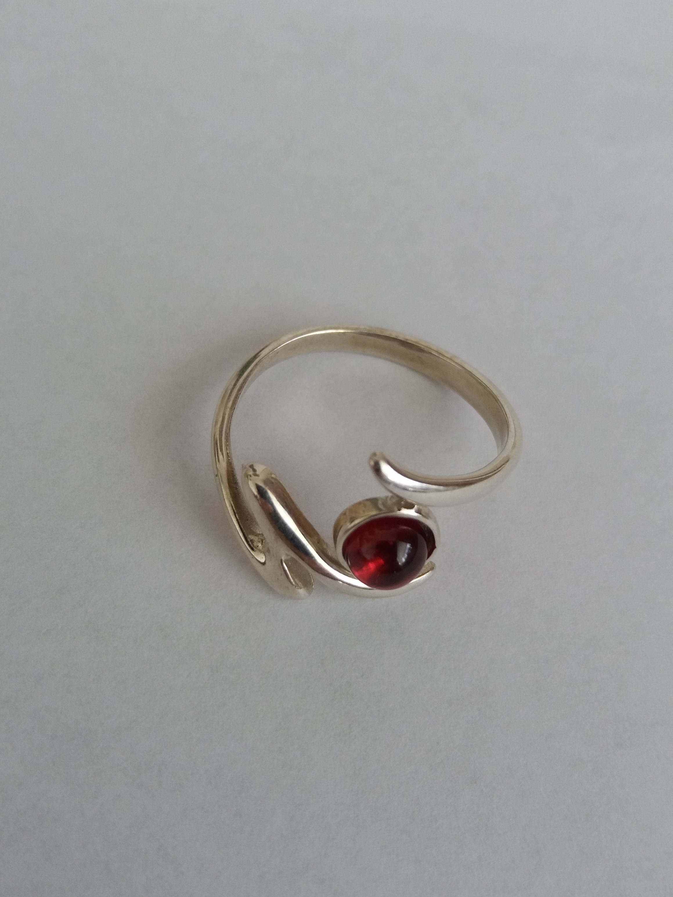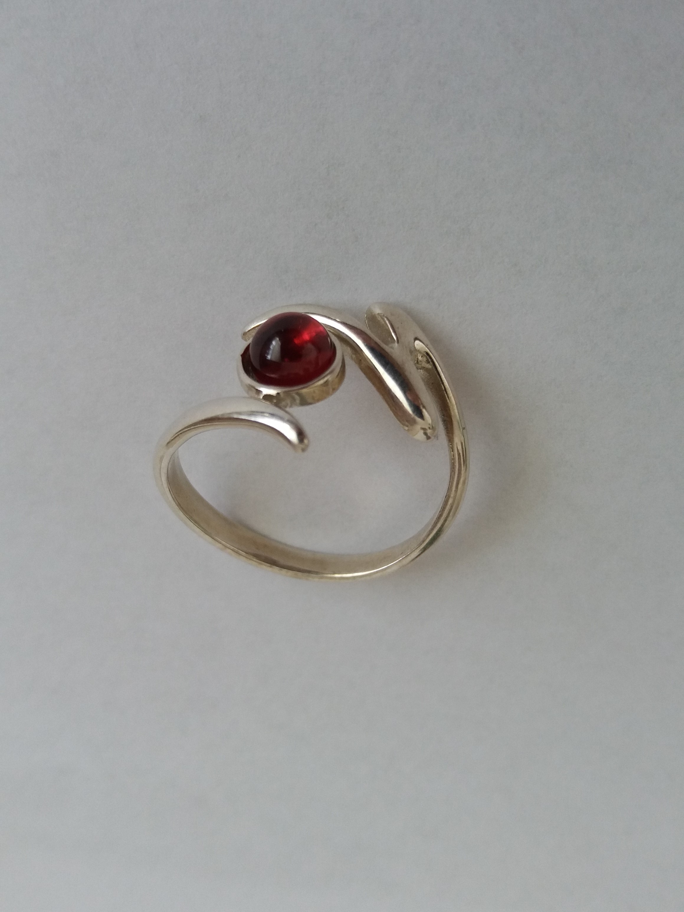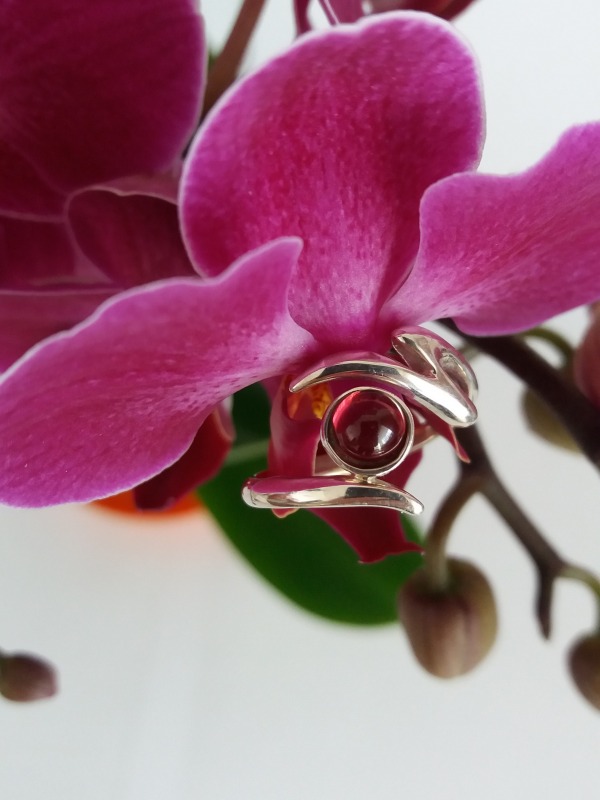 PIERŚCIONEK - srebro pr. 925, oczko z granatu o średnicy 5 mm, obrączka regulowana o średnicy 17 mm, waga 2 g. Granat to piękny i rzadki kamień łączony z ognistą energią, wyzwala talenty i pasje, dodaje motywacji i przywraca radość. Pierścionek wykonany techniką unikatową, hand – made, design, nowoczesny, indywidualny stworzony dla kobiet i dziewcząt lubiących ciekawe i niepowtarzalne wzornictwo.