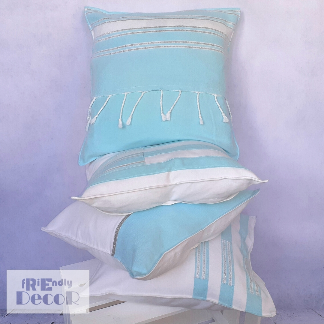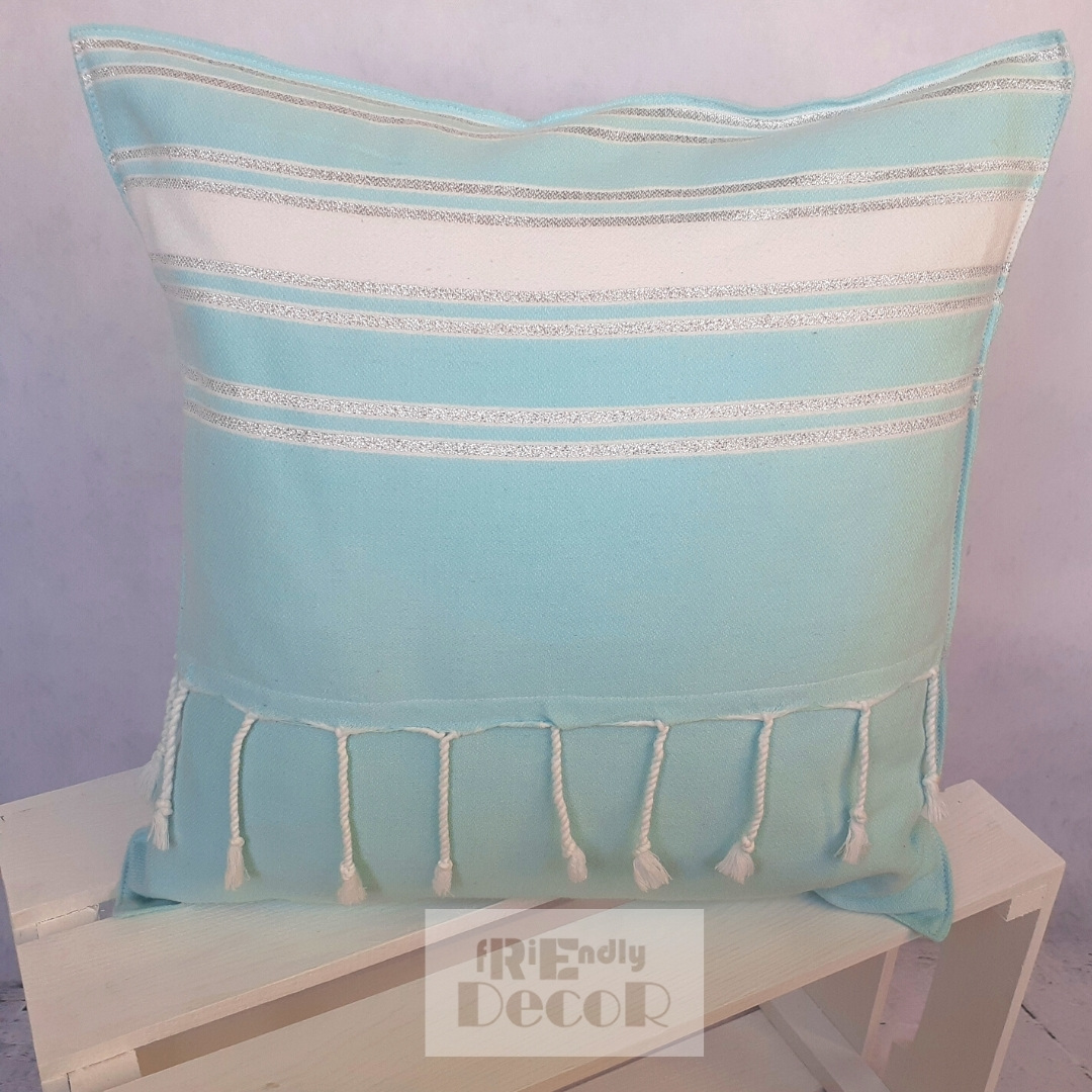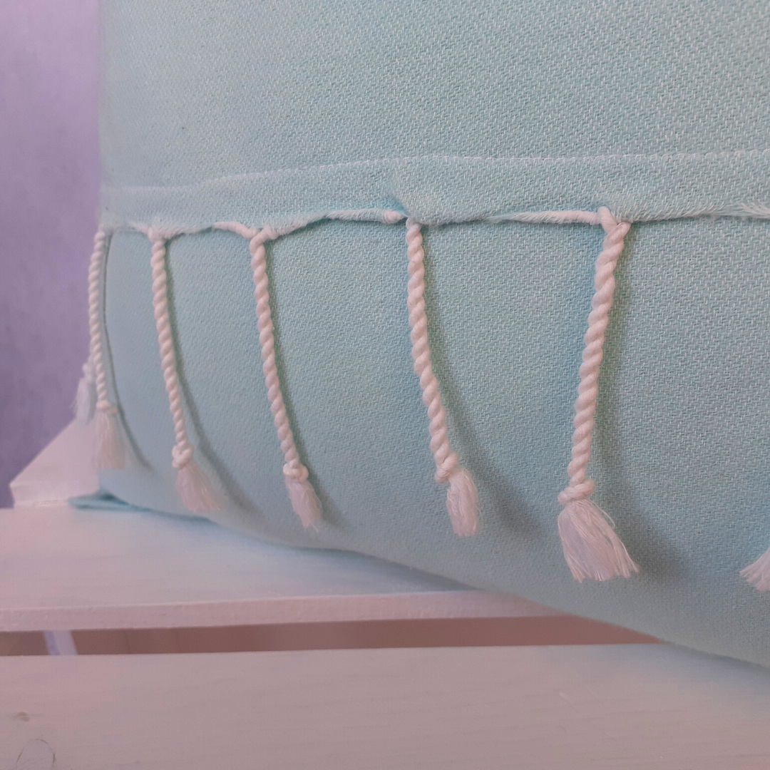 Ręcznie wykonana poszewka dekoracyjna z frędzlami, w odcieniu jasnego turkusu.