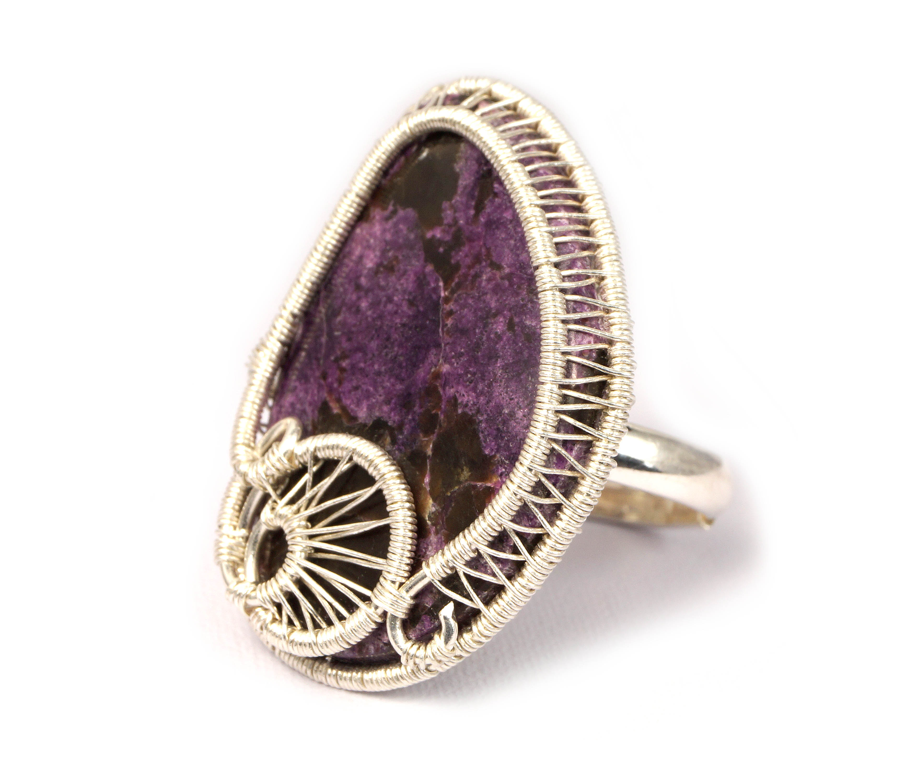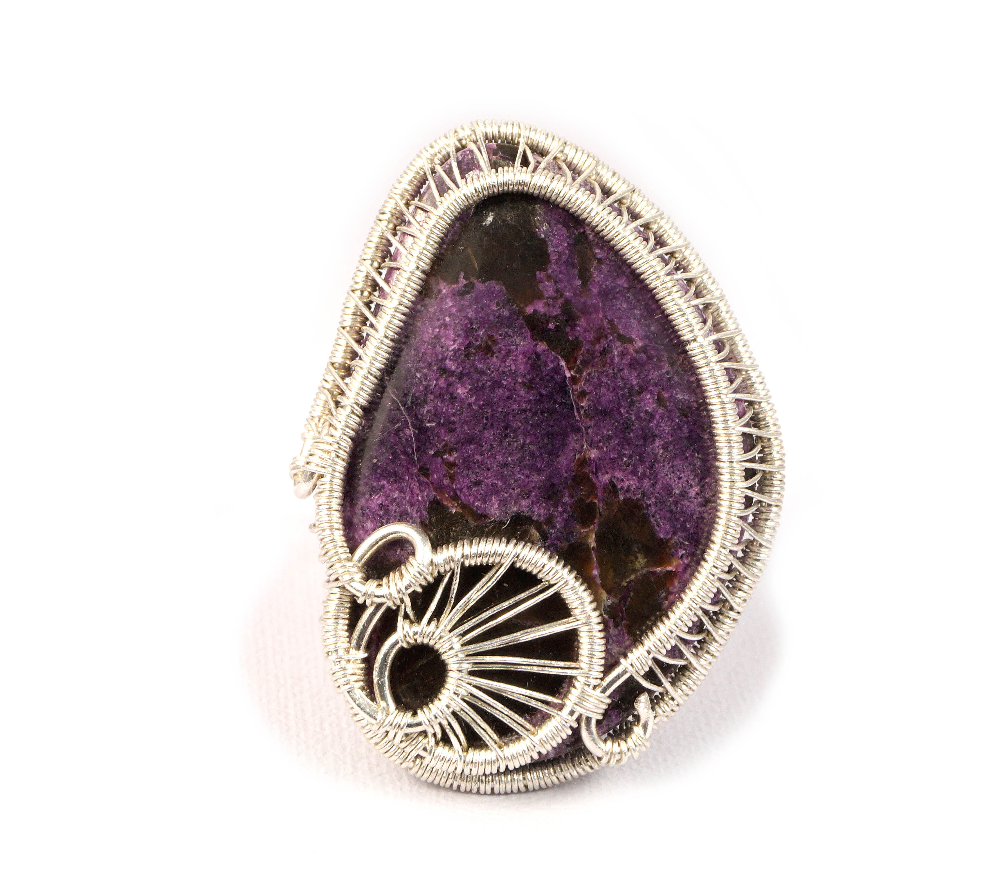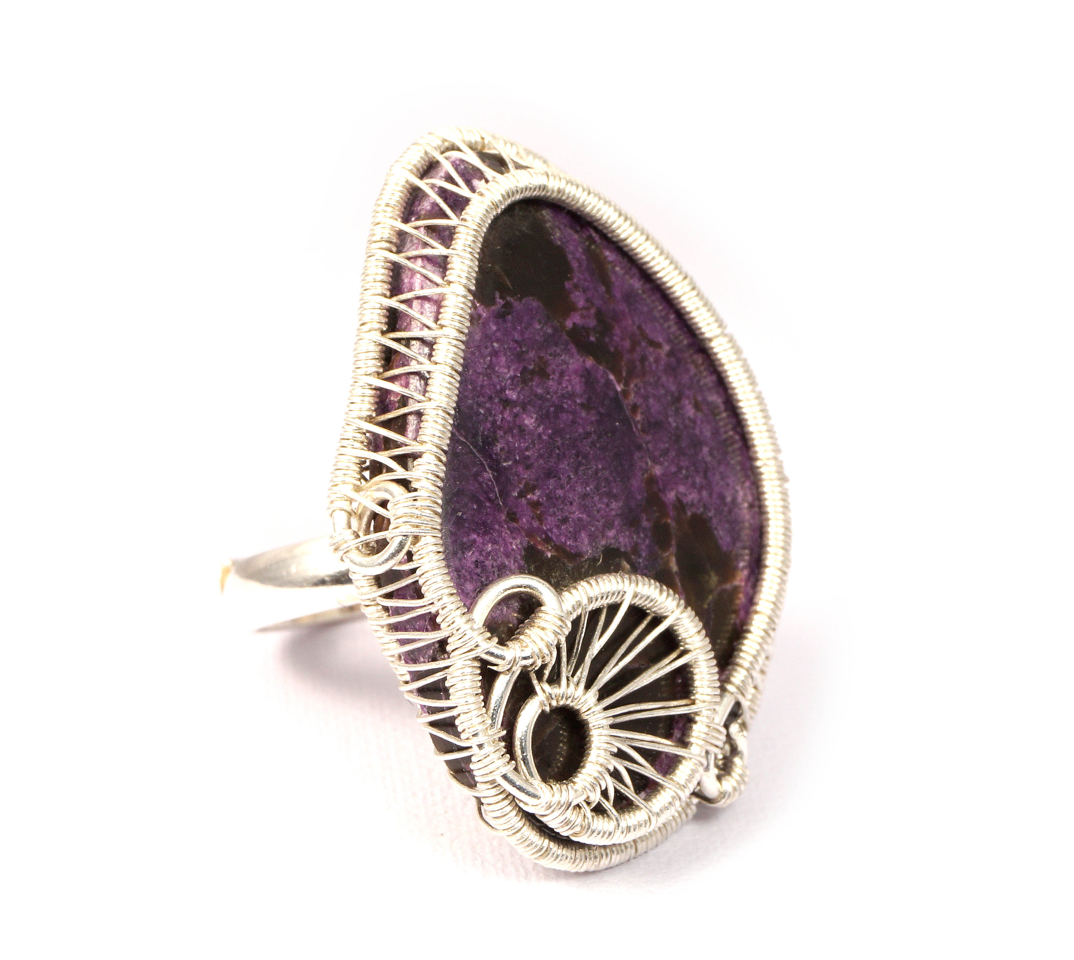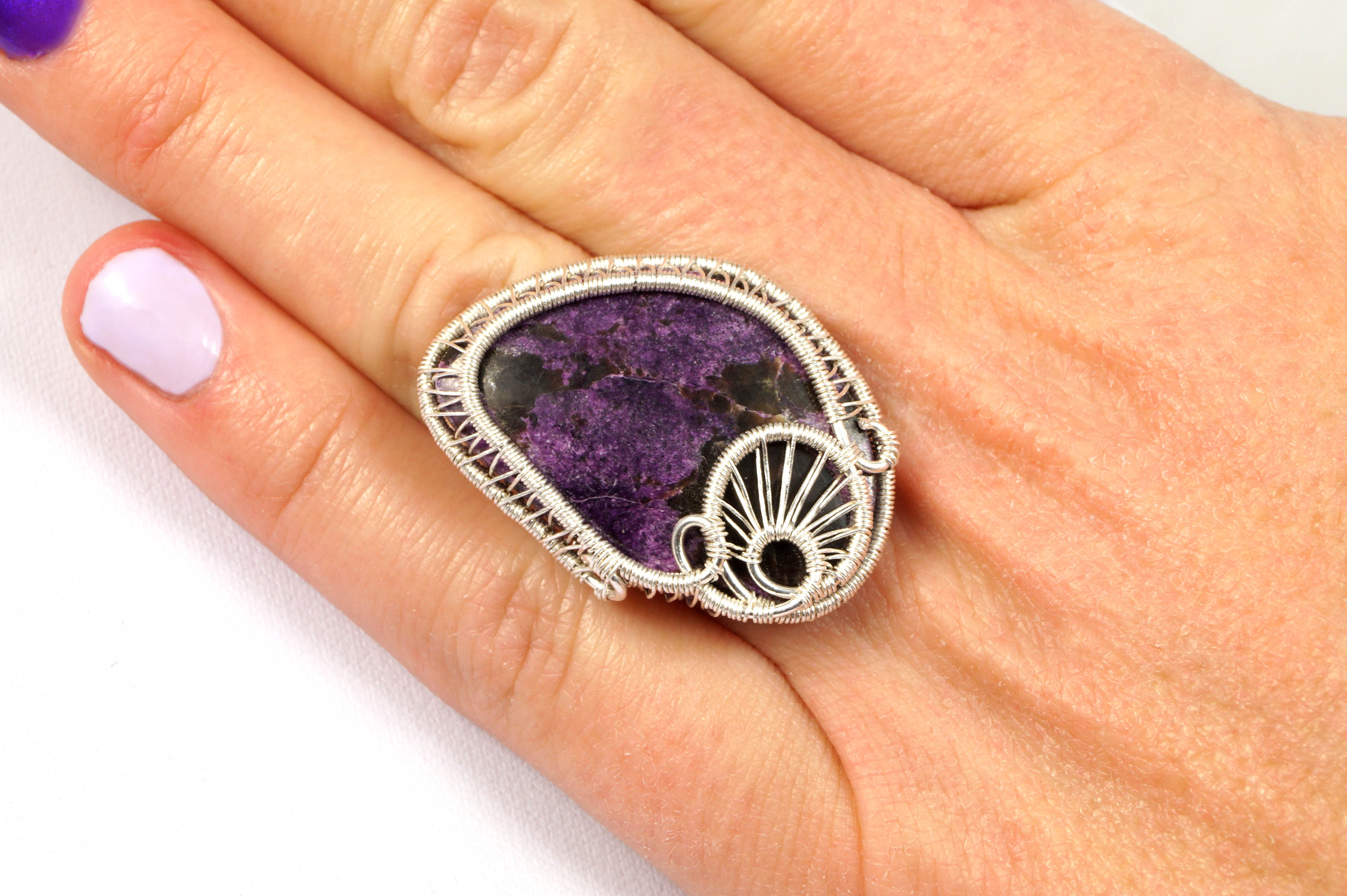 Misternie wykonany pierścionek z kaboszonem purpurytu w fioletowo czarnym kolorze.