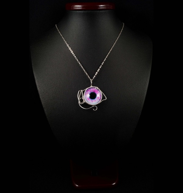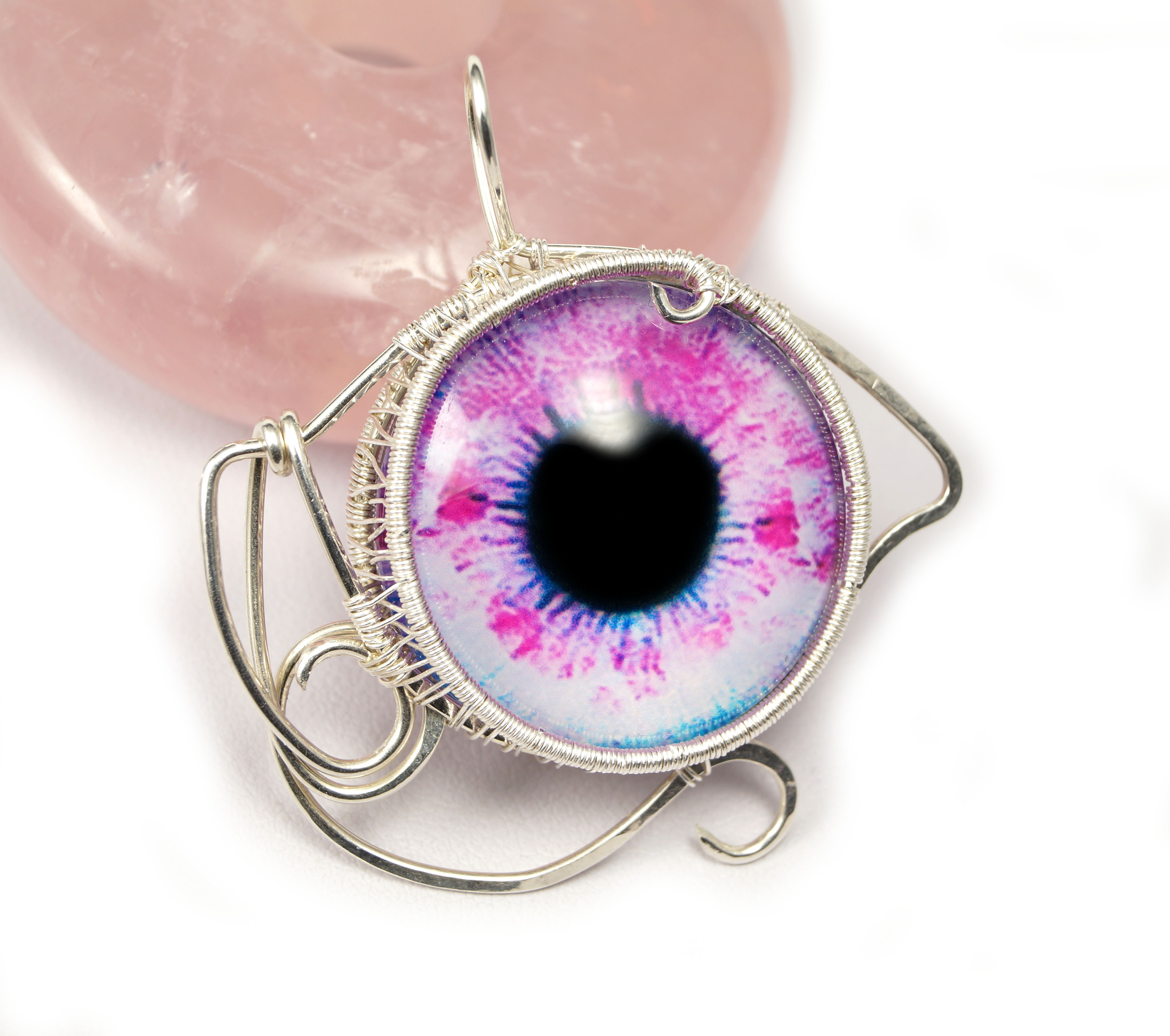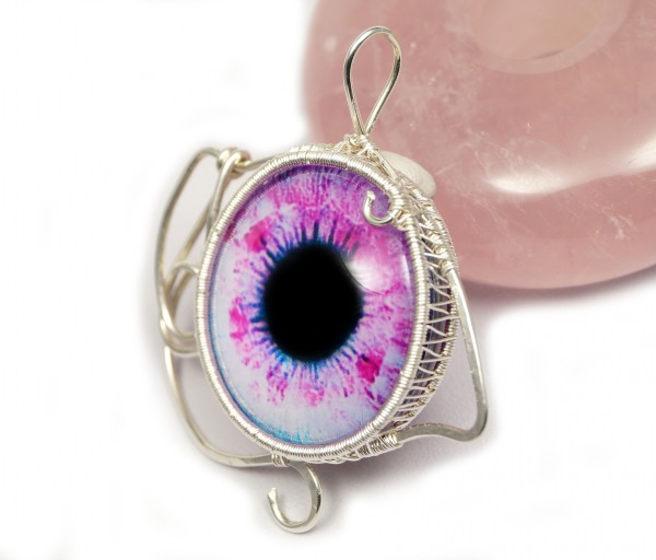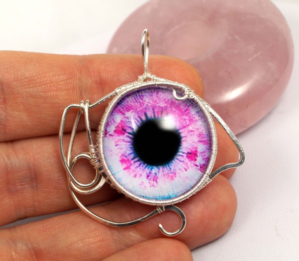 Różowe oko, srebrny wisior ze szklanym okiem, dwustronny, ręcznie wykonany, niepowtarzalny prezent