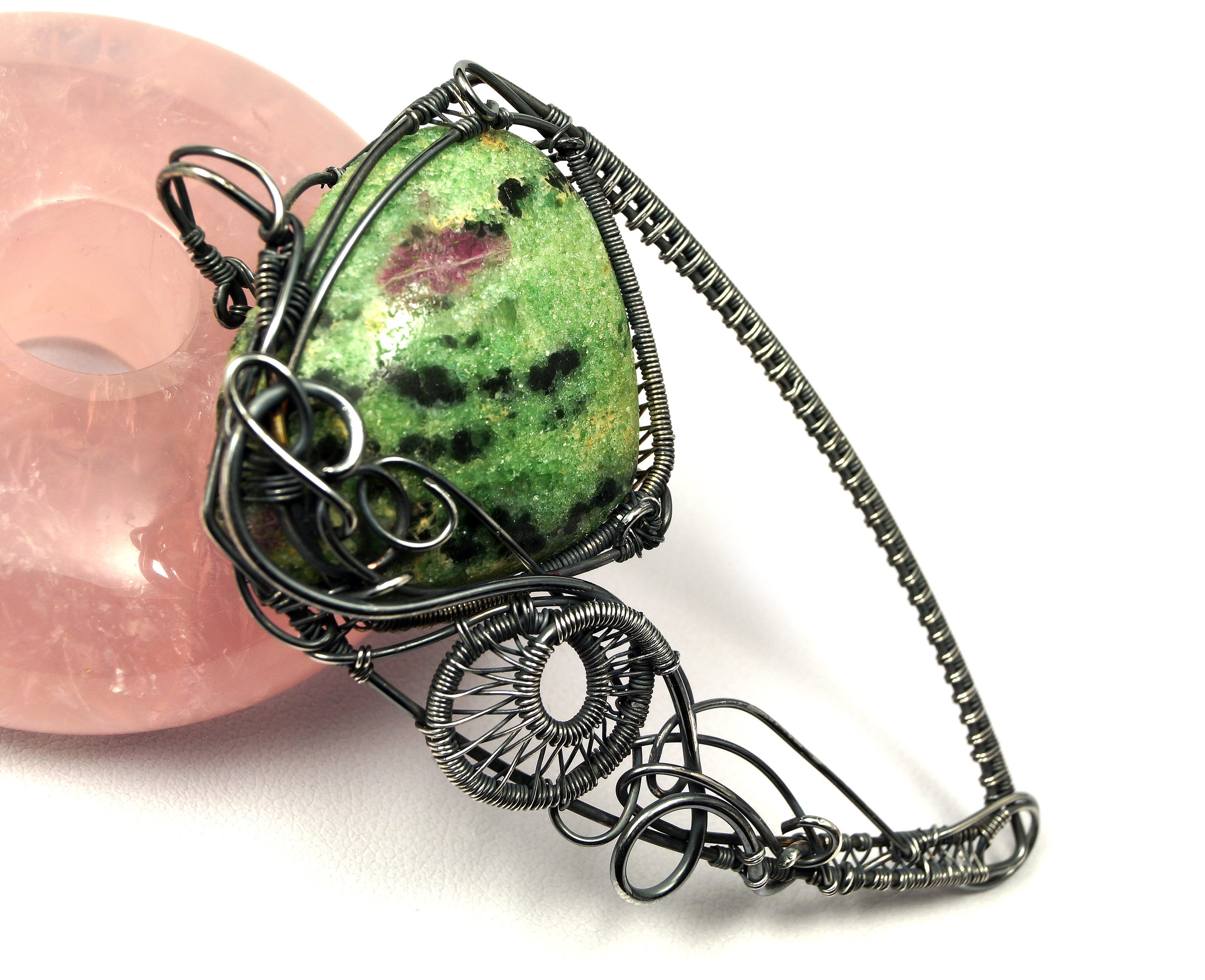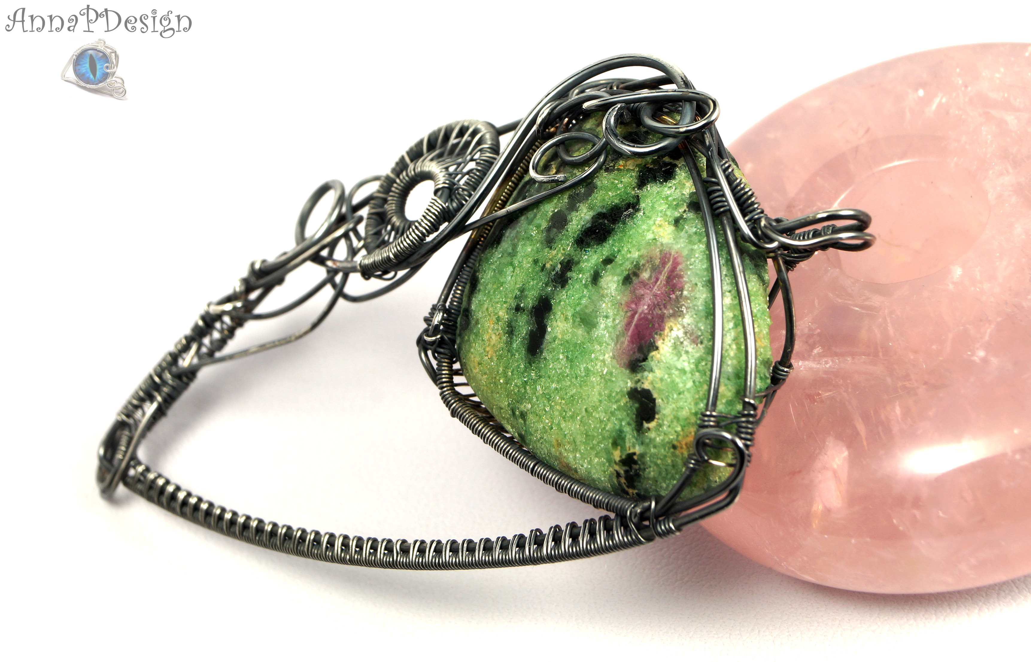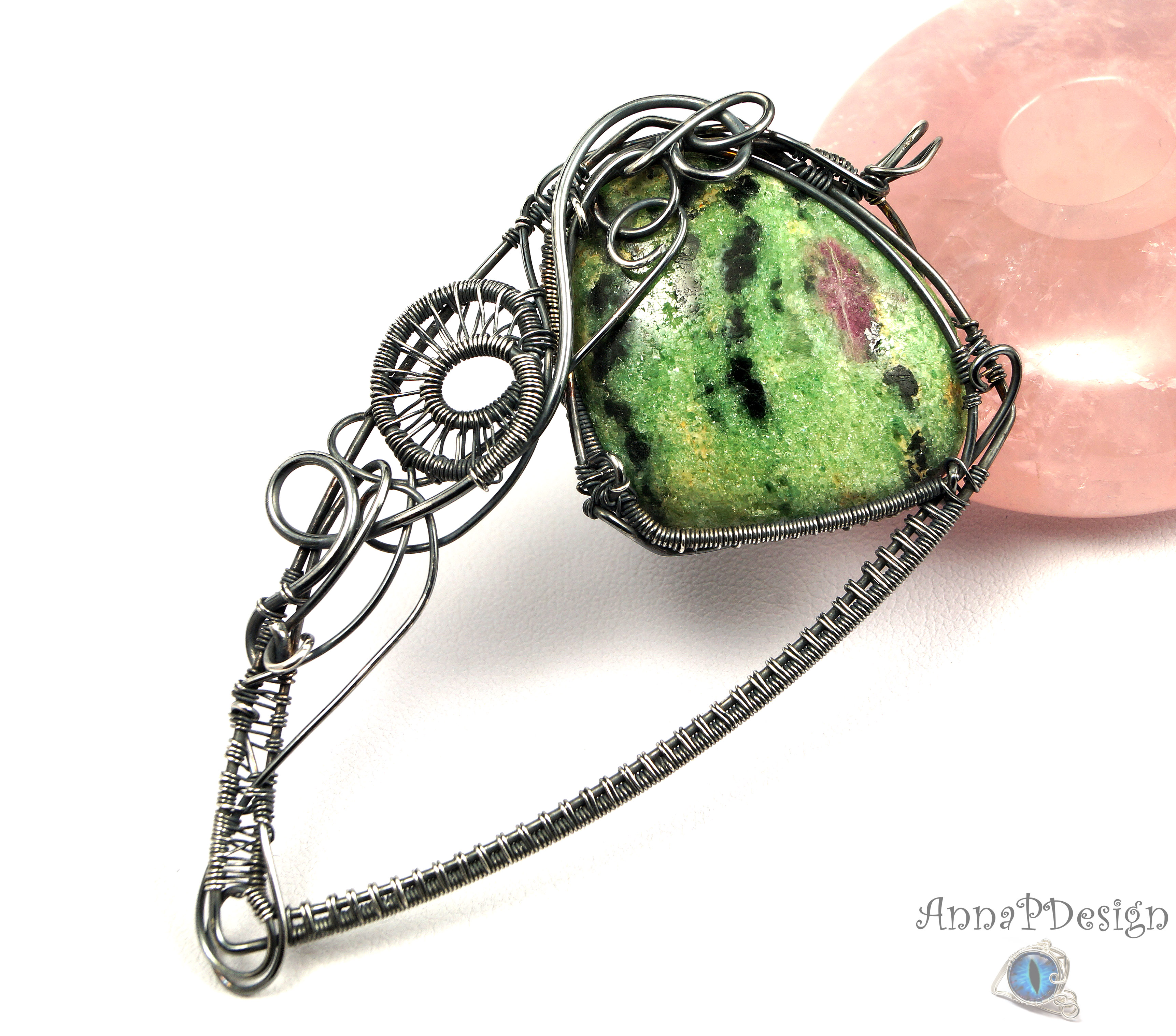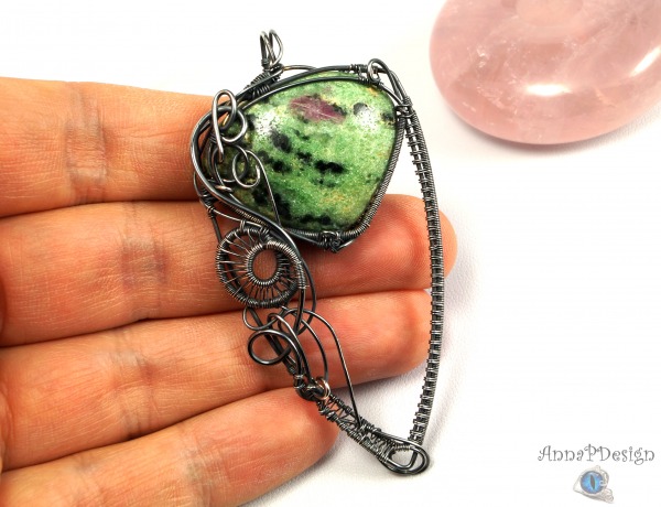 Wisior zaprojektowany i wykonany przeze mnie od podstaw bardzo pracochłonną i precyzyjną techniką wire-wrapping z se srebra próby 925, 930 i 999.