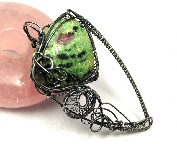 Niepowtarzalny, misternie pleciony wisior z plastrem rubinu w fuchsycie.