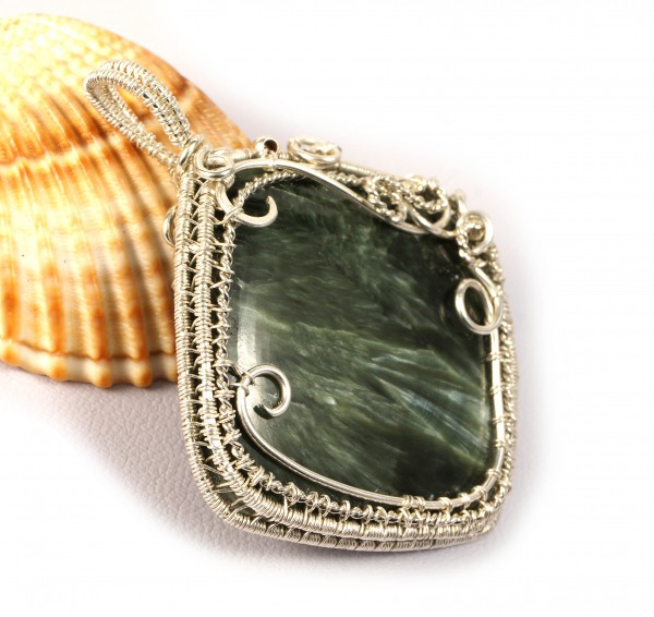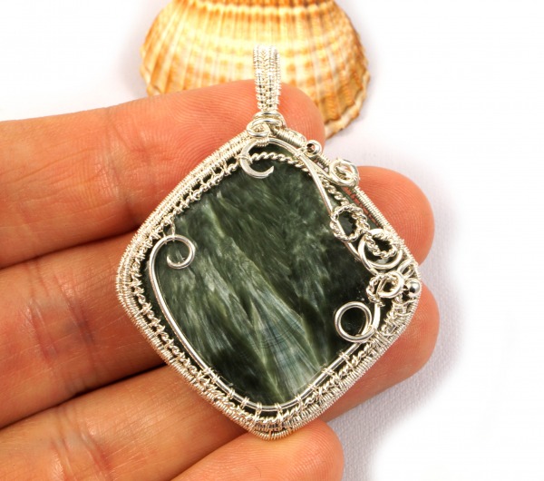 Serafinit, Srebrny wisior z serafinitem, zielony, ręcznie wykonany, na prezent