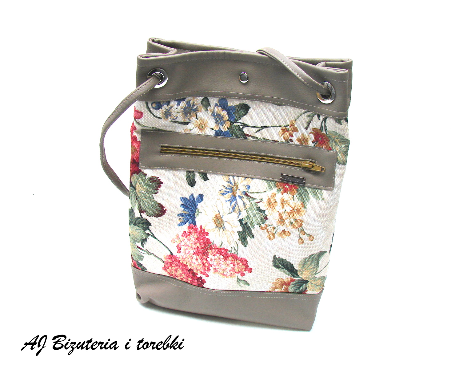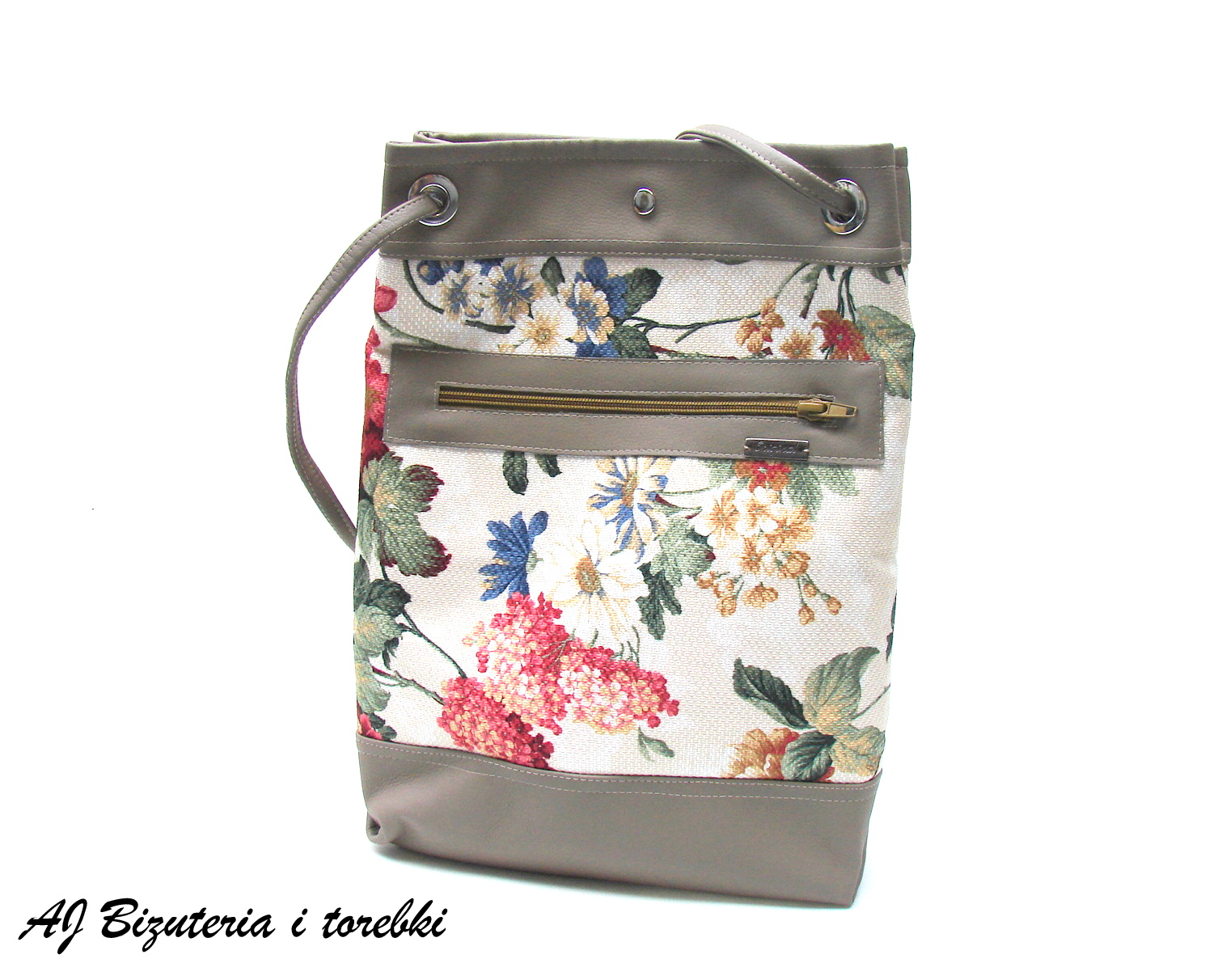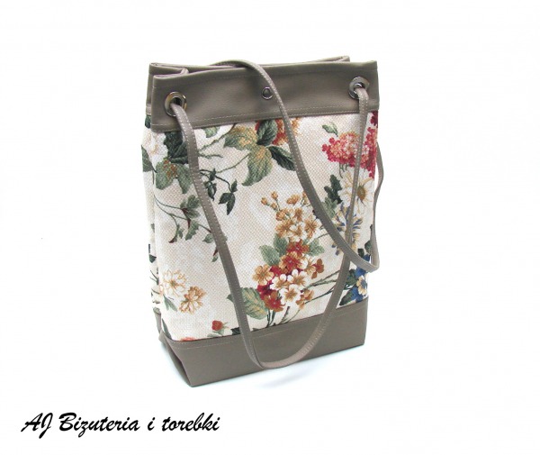 Wygodna torba typu worek. Wykonana z eko skóry i tkaniny tapicerskiej w kwiaty bardzo wytrzymałej na przetarcia . Całość zapinana na magnes , wewnątrz jedna komora z kieszonkami w tym jedną zapinaną na suwak, na zewnątrz również kieszonka zapinana na suwak. Torba wzmocniona fizeliną co zapobiega rozciąganiu. Mieści format A4. Uszy torby przewleczone przez koła.