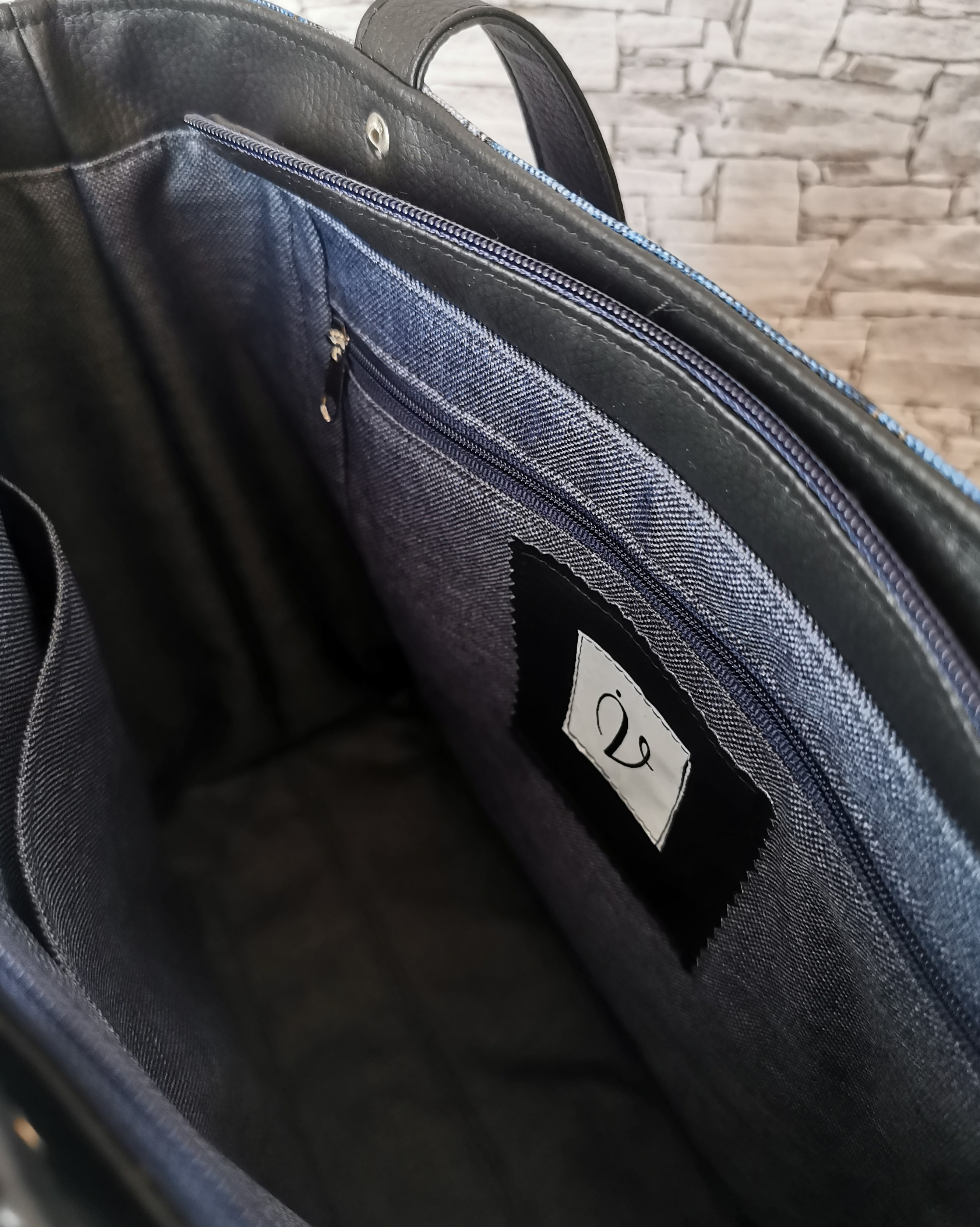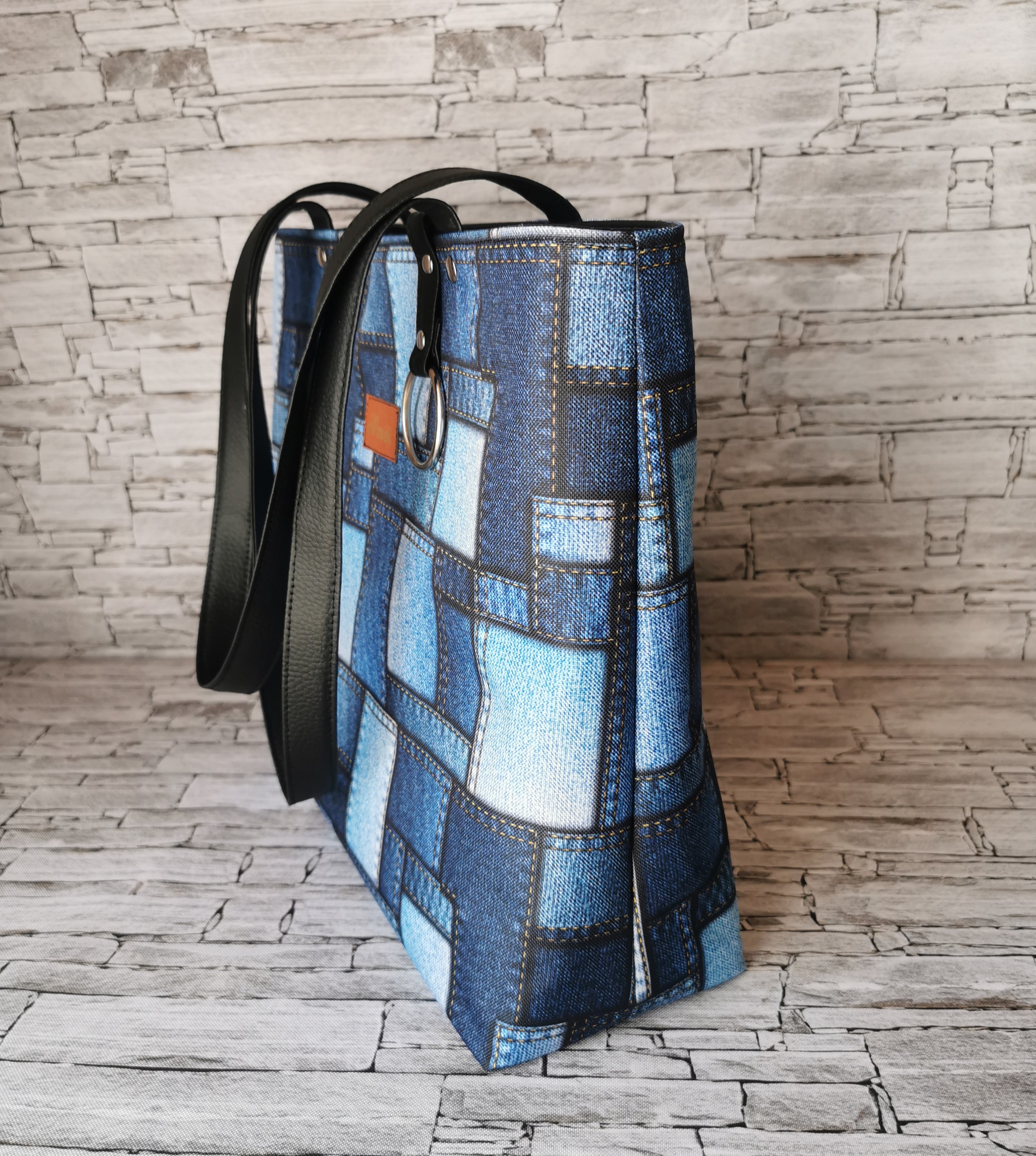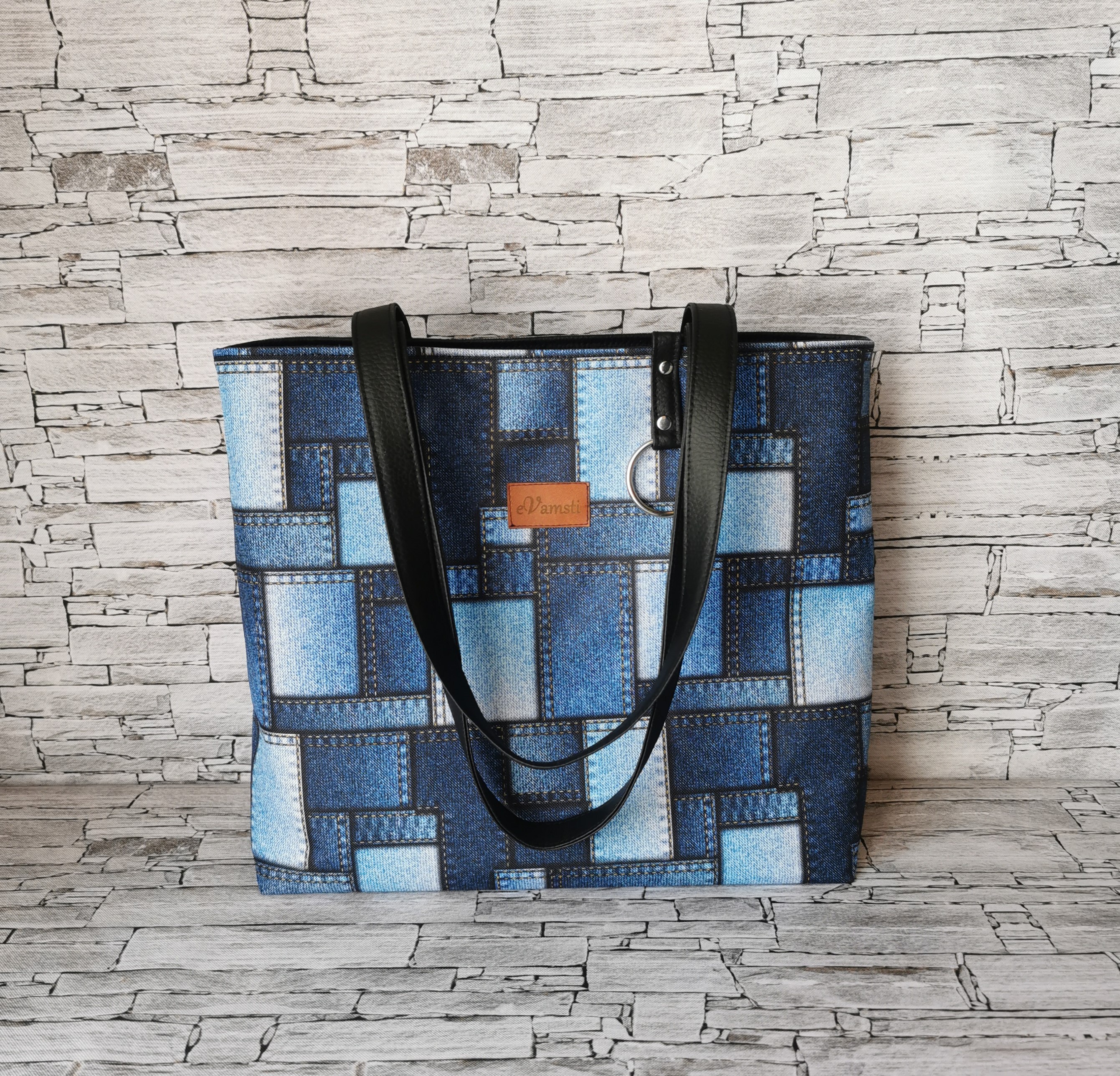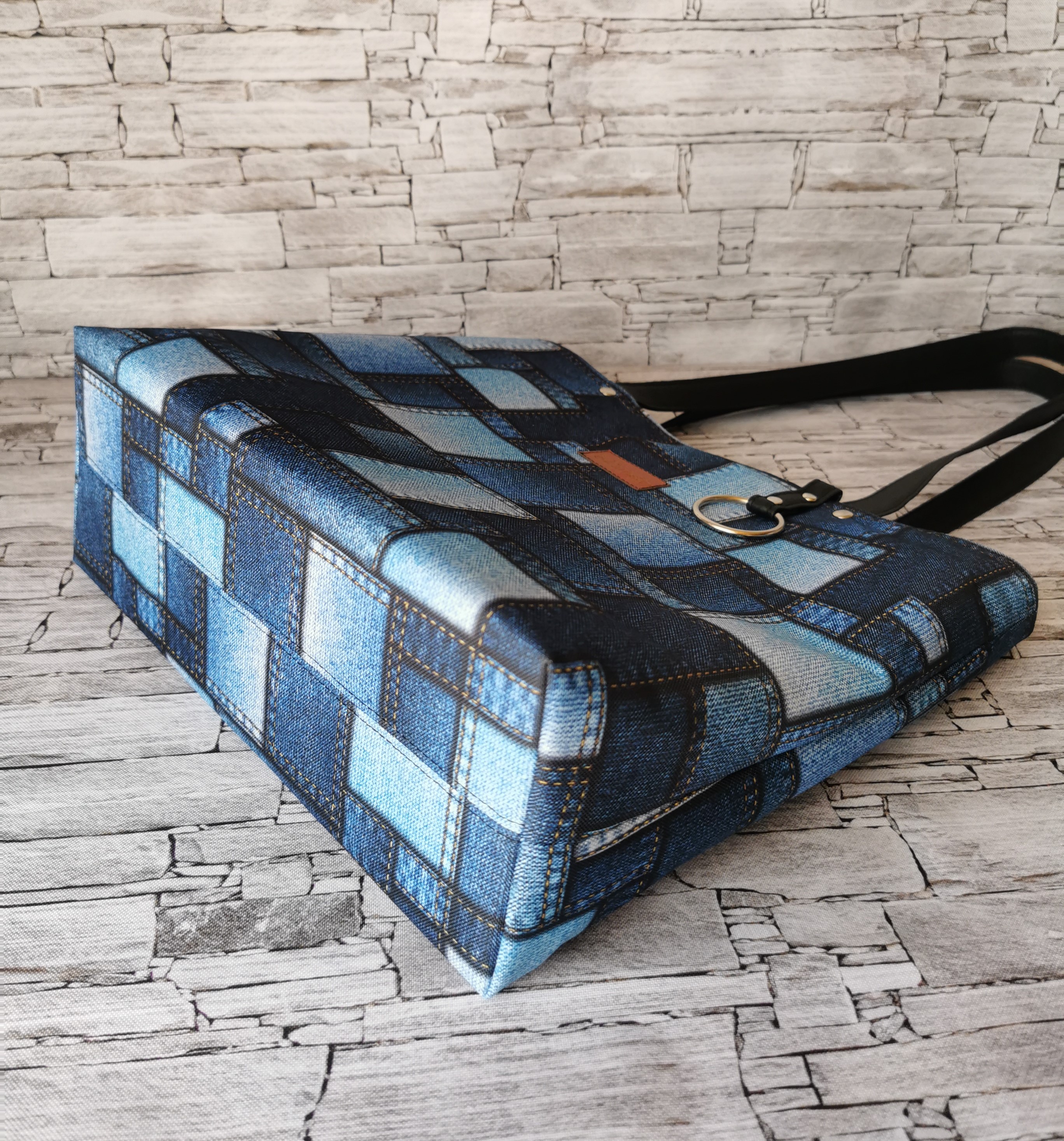 Pojemna torebka na ramię typu shopper. Wykonana z tkaniny poliestrowej o wzorze jeansowych łatek. Góra torebki zapinana na zamek obszyty czarną ekoskórą. Uszy torebki wykonane zostały z czarnej ekoskóry. Wewnątrz są dwie pojemne kieszenie, jedna z nich zamykana na zamek. Torebka została zaopatrzona w wygodną smycz z karabińczykiem na klucze. Podszewka wodoodporna w kolorze niebieskim. Torebka usztywniona, dodatkowo dno usztywnione pianką. Swobodnie mieści format A4