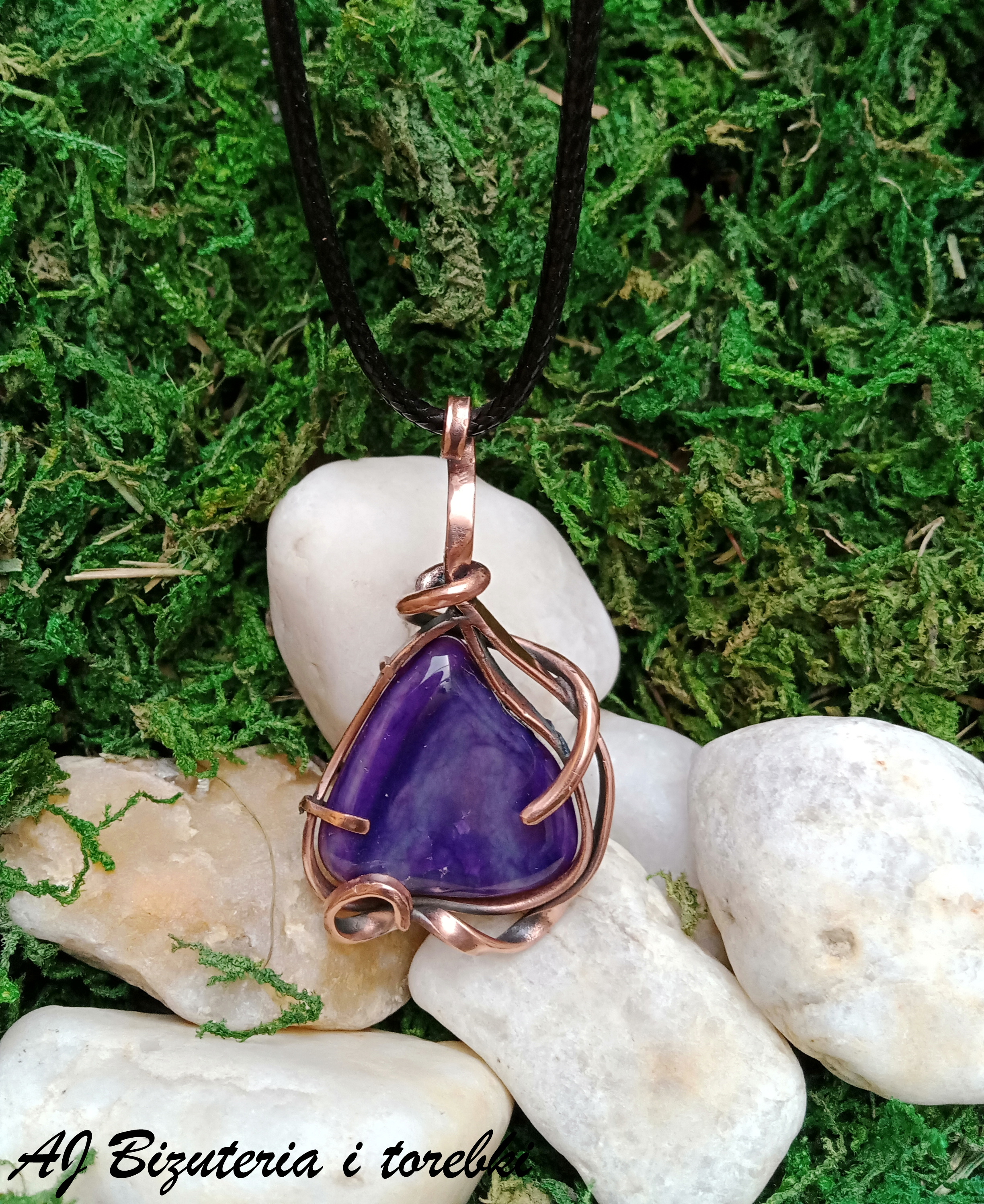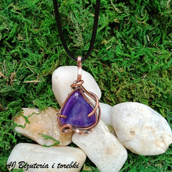 Wisior z z fioletowym jadeitem oprawionym w miedź. Całość zawieszona na woskowanym sznurze.